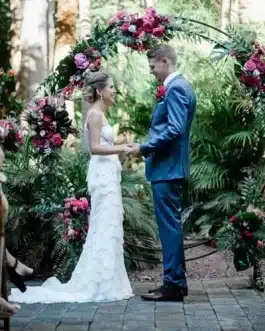 Arbour Brown Timber 1 x silk flower arrangement + soft drapes